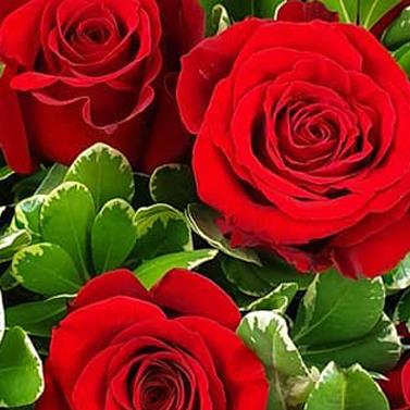 Design includes classic red roses arranged with glossy variegated foliage and rich green leaves, creating a strong, timeless bouquet with deep colour, clean lines and confident, elegant impact.