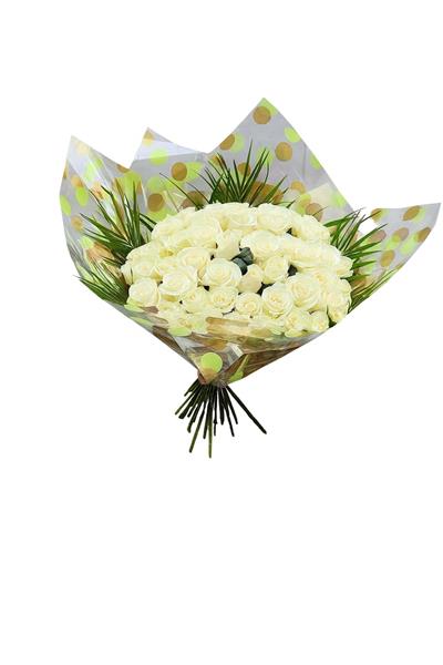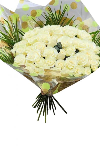 Luxury handtied bouquet of 36 luxury long stemmed white Roses, Finished with palm leaves & presented in a luxury wrwp.