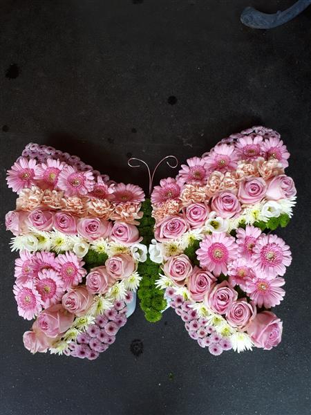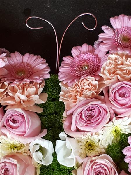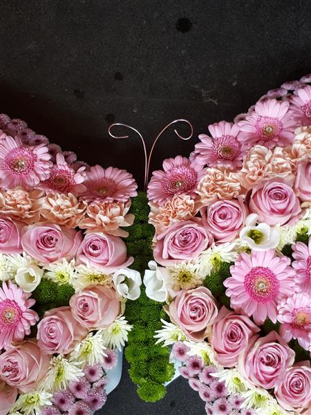 A combination of pinks, and green make the shape of the butterfly tribute. Lovingly hand crafted by our expert team of florists, this piece really does stand out from the crowd with its striking pink germini combined with lush green spray chrysanthemums, and Roses a beautiful final farewell. More colours available. 58x44cms