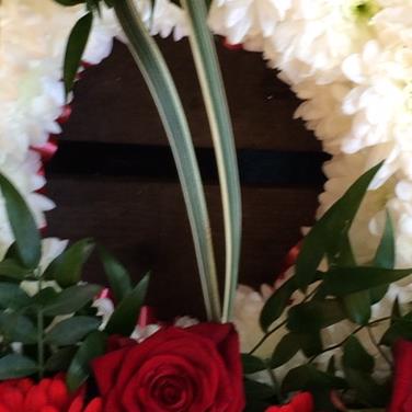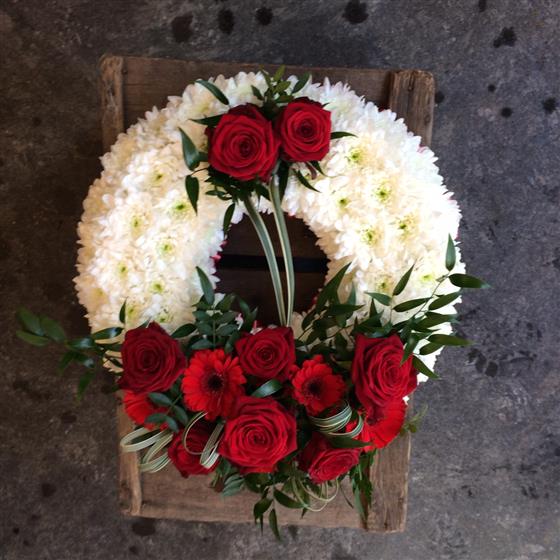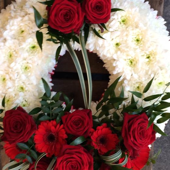 Fully massed wreath with a pure white chrysanthemum base with Red Rose clusters.