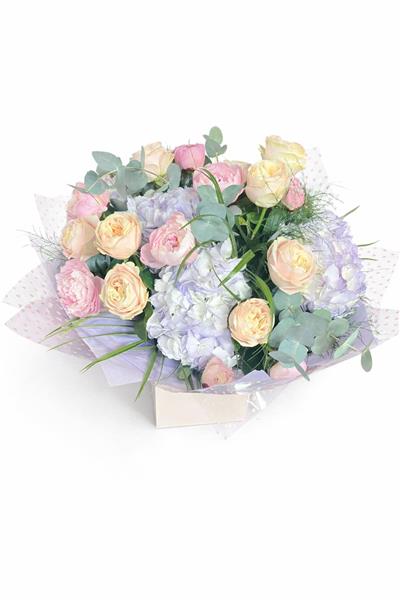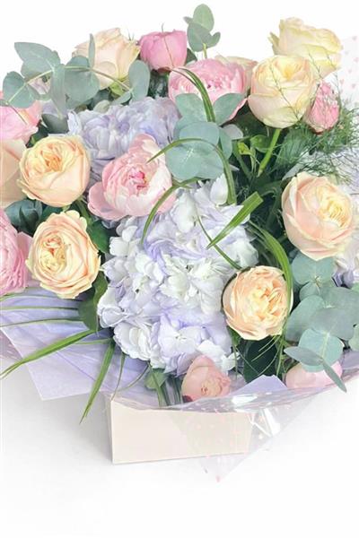 Wowzer what a stunning summer bouquet. Peach garden roses, Peonies and Hydrangea make up this stunning bouquet.Finished with luxury wrap and delivered in water.