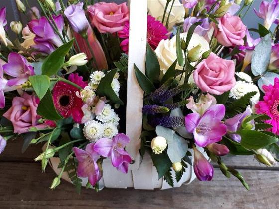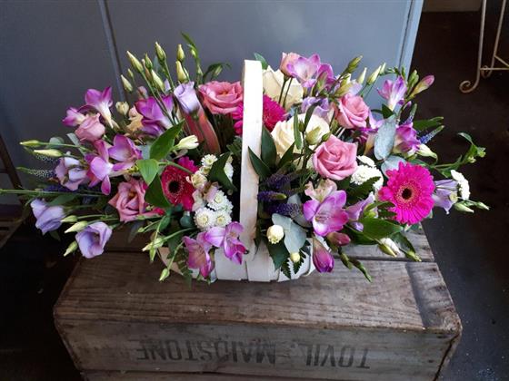 A lovely farewell basket arrangement. Flowers included, Gerbera, Roses, Lizzy, with luxury mixed foliage make up this stunning Trug Basket of flowers.