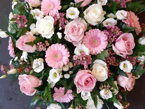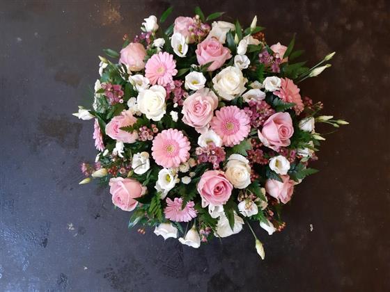 Delicate posy pad tribute. Pastel Pinks and Whites make up this lovely tribute. Roses, Germini, Lizzy are included.