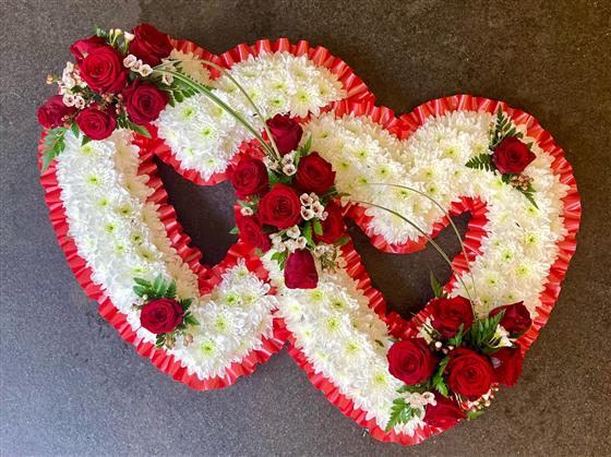 A beautiful open double heart tribute based in white chrysanthemums, complemented with Red Luxury Roses.