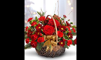 A gorgeous ruby red Christmas flower Basket bursting with Roses and Carnations. A flourish of Holly, Hypericum berry and Blue Spruce complete this seasonal arrangement perfectly.