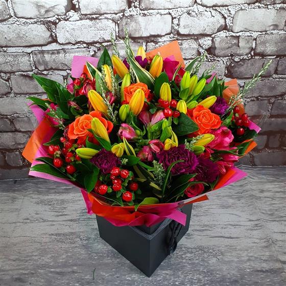 A bold festive arrangement packed with warm Christmas colour. Bright berry reds, glowing oranges and lush winter greens combine to create a lively seasonal display. Every stem is arranged by hand using fresh flowers and natural festive textures, perfect for gifting throughout the Christmas season.