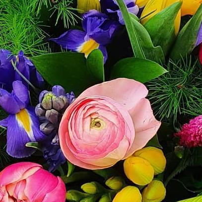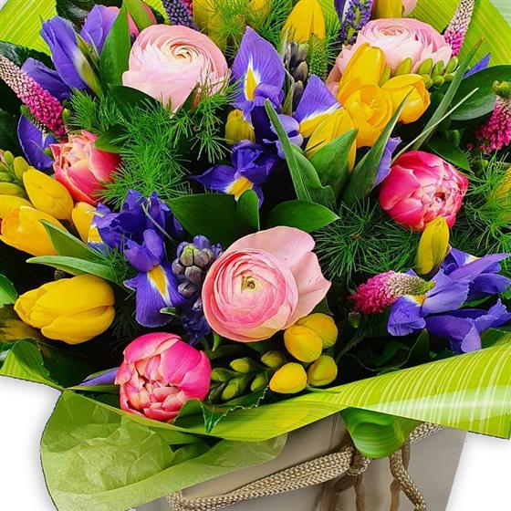 A vibrant flower bouquet bursting with fresh greens, bold yellows, soft pinks and rich blues. Full of texture and movement, arranged in a lively, contemporary style. Featuring tulips, iris, freesia and seasonal textural stems.A touch of spring.