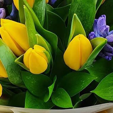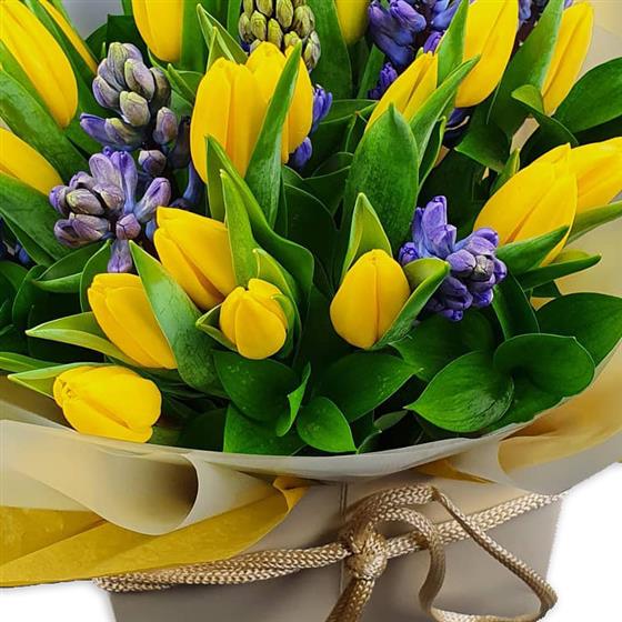 Design includes yellow tulips and hyacinth-style blooms with fresh green foliage, arranged into a crisp, uplifting bouquet that celebrates simple spring colour, clean lines and natural freshness.Colours on what is available