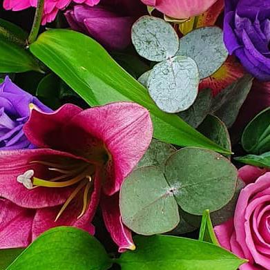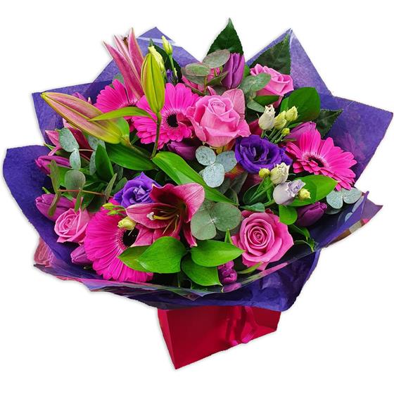 Design includes bright pink gerbera, pink roses, purple lisianthus, pink oriental lily blooms and buds, eucalyptus foliage and fresh green leaves, arranged into a bold, contemporary bouquet with strong colour, texture and lively movement.