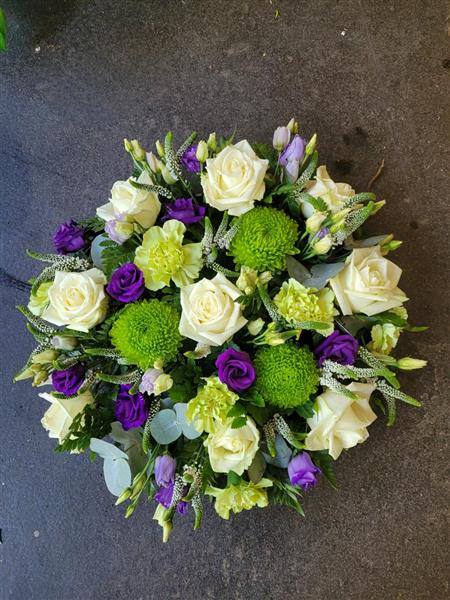 Posy pad.Green shamrocks, White Roses Purple lizzy are included in this lovely heartfelt tribute.