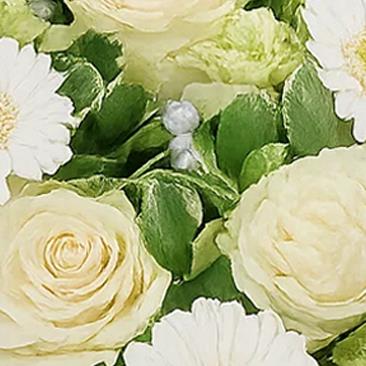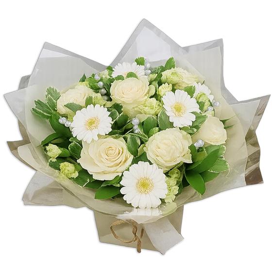 Pale ivory roses meet white gerberas, green carnations in a lush cradle of greenery. A gentle, elegant bouquet that soothes the senses.
