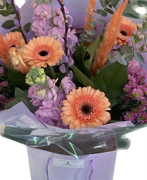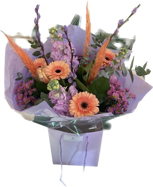 Soft,scented & stylish Bouquet of flowers.Highly sxcented stocks, Peach germini are included to make this stunning Hand tied bouquet, finshed in a luxury wrap & delivered in a matching gift bag.