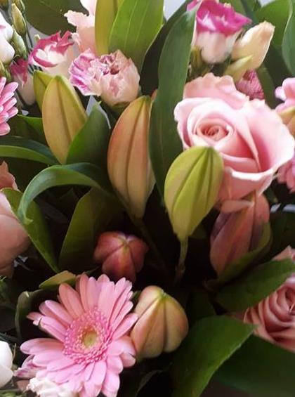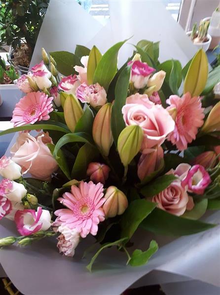 Lovely hand tied bouquet made by our expert florists in shades of pink.Roses, Lillies, Lizzy are included to make up this beautiful Bouquet