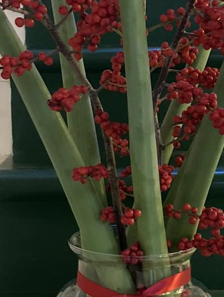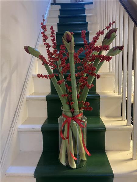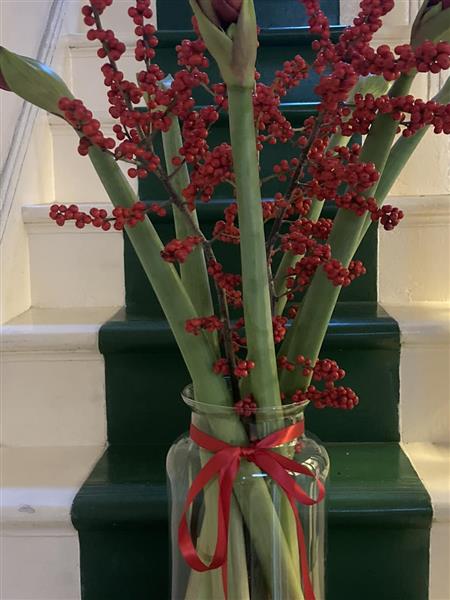 A beautiful vase arrangement of Ilex Berries and red amaryllis a perfect gift at Christmas.