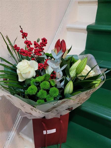 A fresh, seasonal hand-tied aqua bouquet of limes and reds including roses,ilex berries and lillies finished with luxury foliage.