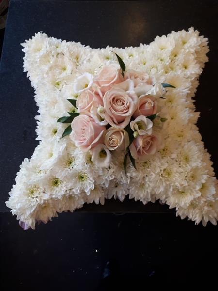Pale pink cushion, finished with pale pink ribbon edge and pale pink sweet avalanche Rose cluster.