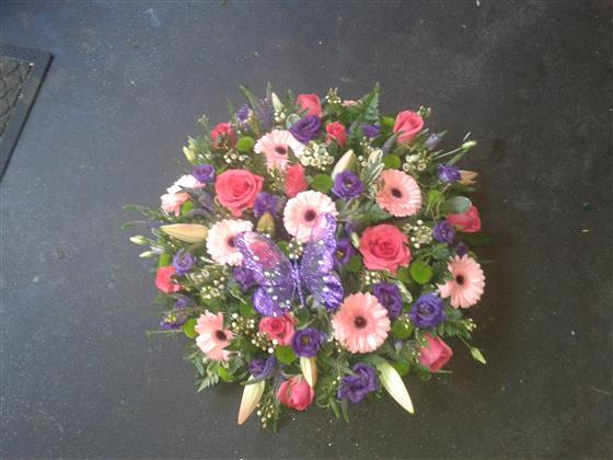 A mixed posy arrangement in pink & Purple Posy Pad, Including Roses, Gerberas and Lisianthus.