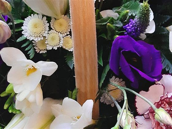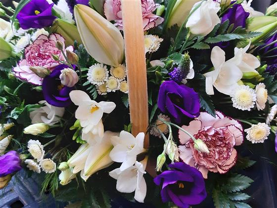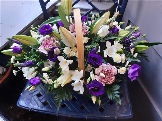 Lovely simple Purple and white arrangement.Arranged in a stylish basket.Roses, Lizzy, Lilies are included to make up this wonderful arrangement.