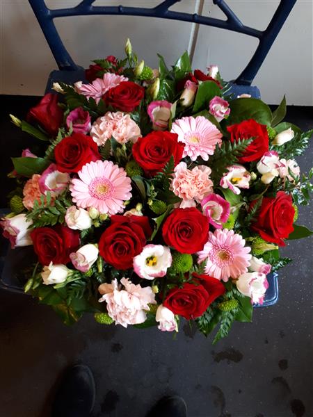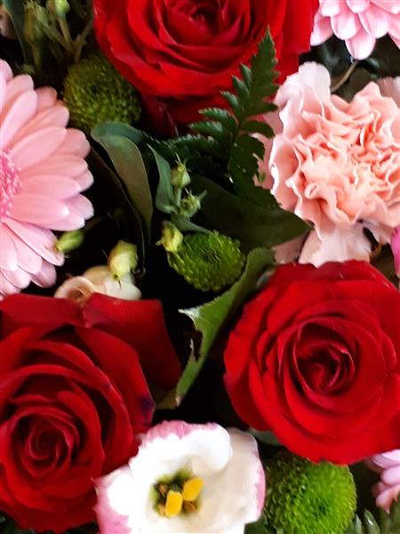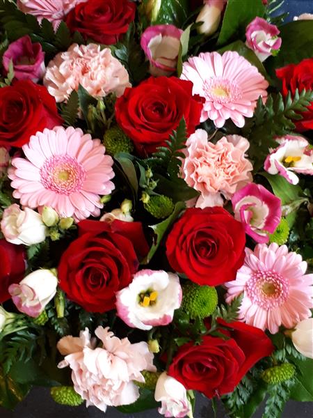 Gorgeous Posy of Red Rose buds with Pink Lizzy and Carnations make up this lovely tribute for a loved one.