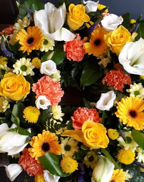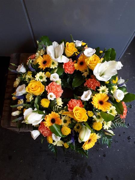 Scentsation wreath a bright vibrant tribute.Roses, Lillies, Gerbera Carnations, Veronica,Chrysanthemums finishing with luxury ferns and foliage make up this lovely farewell tribute.