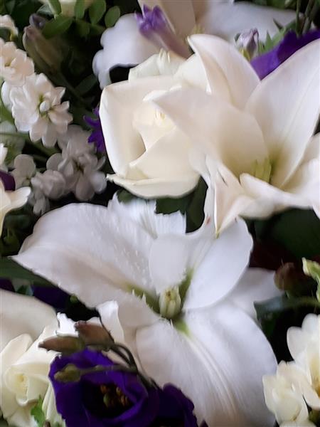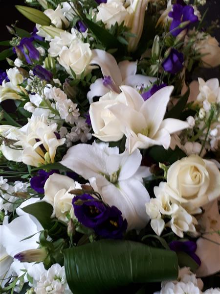 Roses, Lillies, Lizzy, with highly scented Stock and Freesia,finished off with folded Aspidistra leaves.