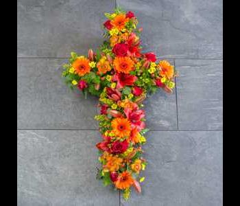 A traditional 'loose' style cross in bright and vibrant tones, arranged in an 'open' style, comprising of orange germini, red Asiatic lilies and various textured foliage, along with touches of yellow to make this piece truly exceptional. Utterly sophisticated and bursting with colour this piece emits heartfelt sorrow and utmost respect for a loved one.