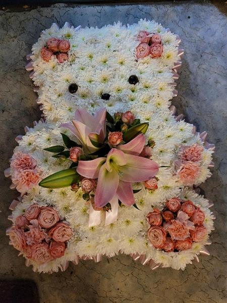 A teddy bear tribute, measuring 32x18in available as pictured with a chrysanthemum base and complementing sprays in a range of delicate pastel shades.