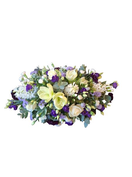White & Purple double ended spray. Seasonal flowers finished with luxury foilage.