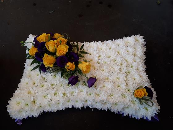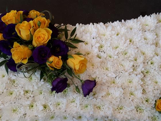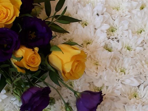 The traditional tribute is created using a white chrysanthemum base and a Yellow Rose & Purple lizzy spray of flowers as pictured. Standard size is 15"